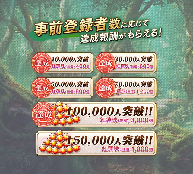 15万人を突破すると紅蓮珠1,000個が追加でプレゼントされる。合計7,000個の紅蓮珠を手に入れるチャンスだ。