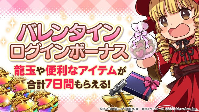 バレンタインログインボーナスでは、 ガチャなどで使用できる龍玉や強化素材など豪華特典をもらうことができます!