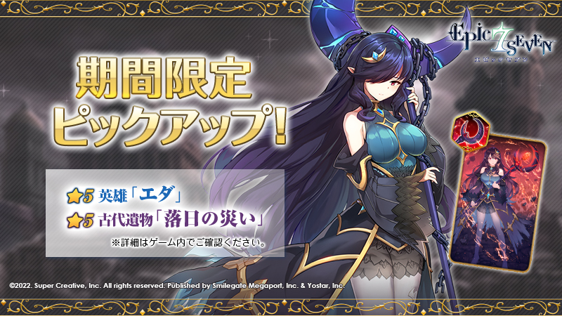 ★5 英雄「エダ」と★5 古代遺物「落日の災い」が期間限定召喚でピックアップ中。詳細はゲーム内を確認してほしい。