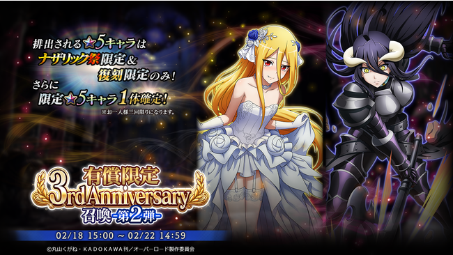 Trysは、『オーバーロード』原作のスマホゲーム「MASS FOR THE DEAD」の3周年を記念したイベントやTwitterキャンペーンを実施することを発表した。