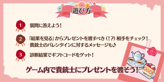 バレンタインデーにどの貴銃士にプレゼントを渡すかを診断することが出来る特設サイトを公開中!更に、 診断で遊んでいただくともれなくゲーム内アイテムがもらえるギフトコードをプレゼントいたします!