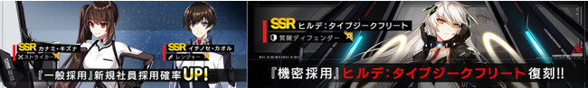 新SSR「カナミ・キズナ」「イチノセ・カオル」を実装、 排出確率がアップするピックアップ採用(ガチャ)ならびに期間限定SSR覚醒「ヒルデ:タイプジークフリート」の機密採用、 既存SSR 3キャラクターのピックアップ採用(ガチャ)をそれぞれ開始した。