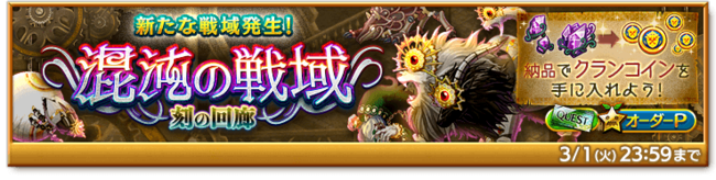 「混沌の戦域~刻の回廊~」を開催中。戦域に新たなエリア「刻の回廊」が登場!15分の制限時間内に「オーダーポイント(OP)」を獲得して納品アイテムを集め、 「クランコイン」を手に入れよう。また、 バレンタインにもぴったりのスウィートなルームアイテムが登場!「ルームショップ」も併せてチェック。