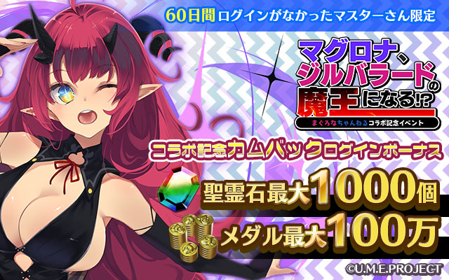 イベントの開催にあわせ「魔王再臨!マグロナガチャ」の販売を開始いたしました。 「魔王再臨!マグロナガチャ」では、 ご本人様描き下ろしの「【挑戦】マグロナ」が登場します。