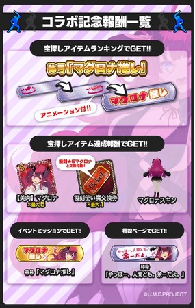 イベントを遊ぶと、 報酬としてご本人様描き下ろしの「【美肉】マグロナ」や、 シューティング中に操作する自機の姿を「魔王マグロナ」に変えられる「マグロナスキン」、 コラボ記念称号などが手に入ります。