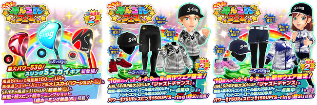 今回のギアガチャでは、 S-ringシリーズより、 最大パワー530に加え新アクティブスキル「スカイパワーショット」「超風神」のほか、 アクティブスキル「超ホーミング無風(S)」を搭載した「スリングSスカイクラブ」が登場いたします。 ウェアガチャでは「S-ring(超S)」「ジャストチャンス」「一点集中」など、 複数スキルを搭載した新作ウェアが登場。