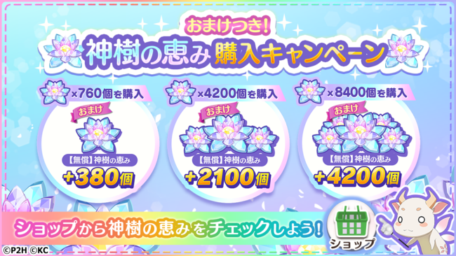 神樹の恵み購入キャンペーンをAndroid版/iOS版及びPCブラウザ版で開催。期間中、 ショップに「神樹の恵み(無償)」のおまけ付き「神樹の恵み(有償)」のアイテムが追加される。ショップをチェックしてみよう。