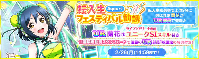 ・UR蘭花は「転入生フェスティバル勧誘~μ's~」および「転入生フェスティバル勧誘~Aqours~」の終了後、 3/5 16:00以降のμ's特待生勧誘と3/20 16:00以降のAqours特待生勧誘から排出されます。