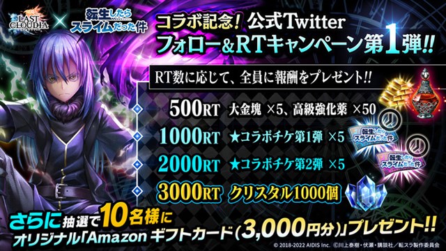 『ラストクラウディア』×「転生したらスライムだった件」コラボを記念し、公式Twitterフォロー&RTキャンペーンを開催する。公式Twitterをフォローし、対象ツイートをRT(リツイート)するだけで参加完了となる。RT数に応じて豪華報酬を全員にプレゼントするほか、抽選で10名にオリジナル「Amazonギフトカード(3,000円分)」をプレゼントする。