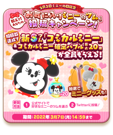 3月2日のミニーマウスの日を記念して、 「ツムツムランド」では新Sツム「コミカルミニー」や素敵なミニーグッズがもらえるプレゼントキャンペーンを実施中。