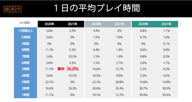 「1日の平均プレイ時間」の中で特に目立つポイントは、 「5時間」と回答するコア層が35%を超えている点です。 2020年に実施した同様の調査と比較して、 20ポイント以上増加しています。 2020年の「1時間」と「2時間」の合計値が約27%、 「3時間」「4時間」「5時間」の合計値が約38%であったのに対し、 2021年の「2時間」と「5時間」のスコアとそれぞれ同等の数値となっています。