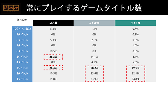 1日の平均プレイ時間が「1~3時間」に集約するライト層やミドル層は、 同じく「1~3タイトル」に回答が集約していますが、 1日の平均プレイ時間が「2~5時間」のコア層は、 「3~5タイトル」のスコアが高く、 「5タイトル以上」と回答するユーザーが全体の約4割を占めています。 中には「20タイトルを掛け持ちしている」という回答も見られました。