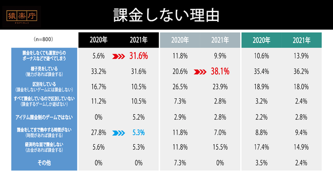 「課金をしない理由」の中で特筆すべきは、 「課金をしなくても運営からのボーナスなどで遊べてしまう」と回答するコア層が30%を超えている点です。 2020年と比較すると、 25ポイント以上スコアを伸ばしており、 「様子見(魅力があれば課金)」と同レベルになっています。 昨今、 無償アイテムを多く配布するタイトルが増加しており、 これは総じてユーザー評価も高くなる傾向にありますが、 一部からは「課金する必要が無いので運営が続くのか心配」といった意見も少なくありません。