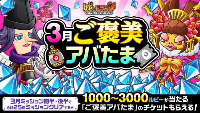 「3月ミッション」前半と、3月18日からスタートする後半、双方のミッションの中から合計25個クリアすると、“ご褒美アバたまチケット”が1枚もらえる。このチケットは1000〜3000ルビーが当たる特別なアバたま「ご褒美アバたま」を回す際に必要となるチケット。