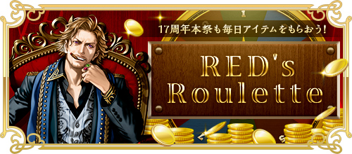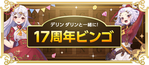その記念として、 本日より「クロウBOX[取引不可]」や「祈りのカケラ探索機」などが手に入る「RED's Roulette」やコンプリートする事で「17周年変身リング[デリン]」もしくは「17周年変身リング[ダリン]」が手に入る「17周年ビンゴ」といったイベント盛りだくさんの「17周年本祭」を実施している。