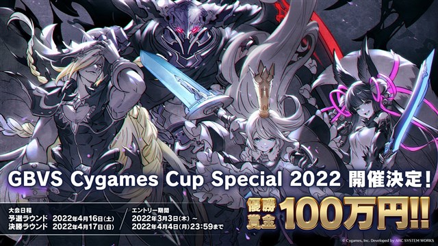 「GBVS Cygames Cup」は、誰でも気軽に参加できる『グランブルーファンタジー ヴァーサス』のオンライン完結型の大会。今回開催する「GBVS Cygames Cup Special 2022」は、同大会では初となる賞金制の大会で、優勝者は賞金100万円を獲得することができる。