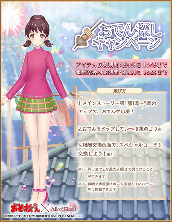 EXNOAは、 花人形(アリス)の着せ替えが楽しめる『Alice Closet(アリスクローゼット)』にて、 「おそ松さん」とのコラボを開始した。