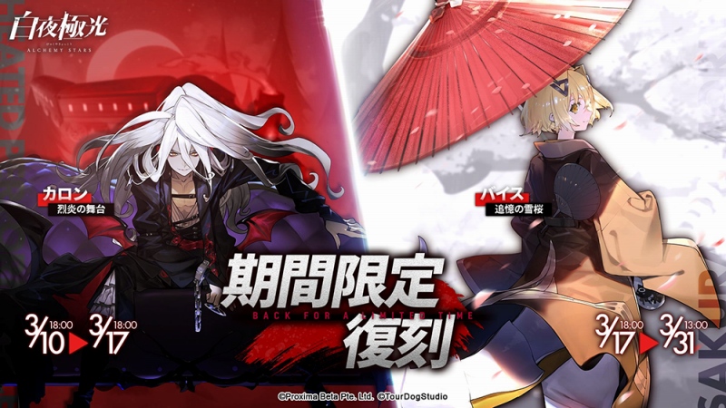 Proxima Betaは、『白夜極光(びゃくやきょっこう)』において、新期間限定イベント「紅に雪の散る如く・上」を3月10日より開催する。
