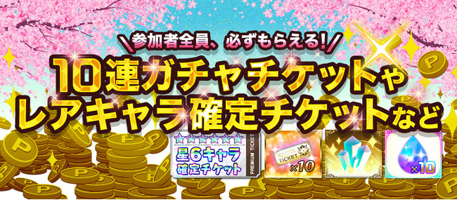 キャンペーン期間中、 対象のゲームをプレイすることで、 10連ガチャチケットやレアキャラ確定チケットなどの特典アイテムが全員必ずもらえる。