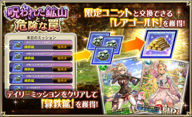 “呪われた鉱山と危険な罠”は、 デイリーミッションで獲得したイベントアイテム「緑鉄鉱」を使用する事で、 特別クエストが解放され、 オフェリーとジャンヌが“呪われた鉱山”で発生したトラブルを解決するために奮闘するスペシャルシナリオが楽しめる。