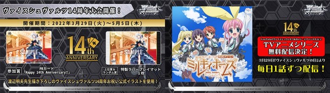 ヴァイスシュヴァルツ14周年記念大会を3月29日(火)~5月5日(木)に開催致します。参加賞や上位賞・ランダム賞では渡辺明夫先生描き下ろしの14周年記念イラストを使用したPRカードとラバーマットの配布を予定しています。