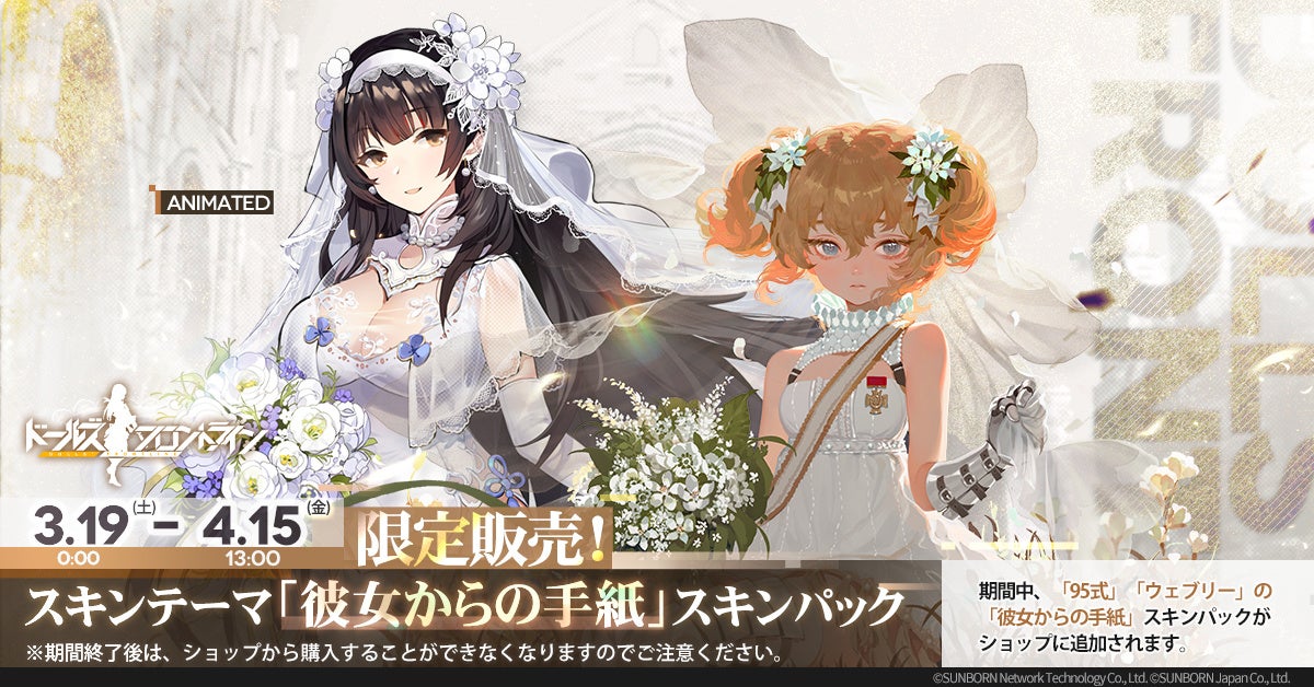 花々に彩られたウェディングドレス姿の人形が登場する新スキンテーマ、「彼女からの手紙」が3月19 日0時よりゲーム内に追加される。更に今回は限定のボイス付き!また、同テーマの「95式」「ウェブリー」のスキンパックをショップにて期間限定販売する。