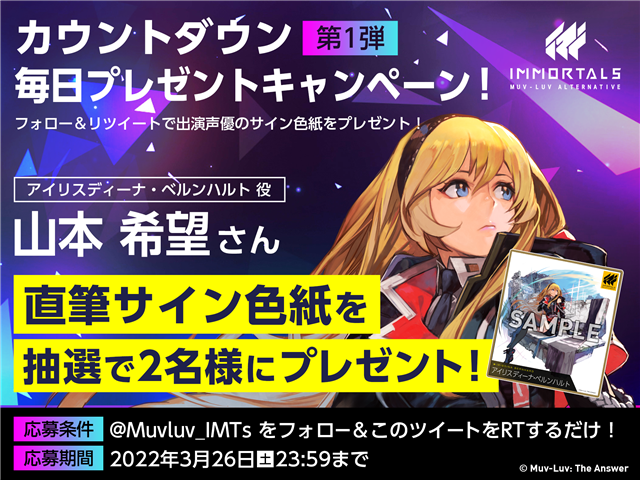 記念すべき1日目は、アイリスディーナ・ベルンハルト役の山本希望さんの直筆サイン色紙を抽選で2名にプレゼントする。色紙はキャラクターのイラスト付きのオリジナル豪華色紙となっている。リリースまであと少し!キャンペーンに参加して待とう。詳細は公式Twitter(@Muvluv_IMTs)を参照。