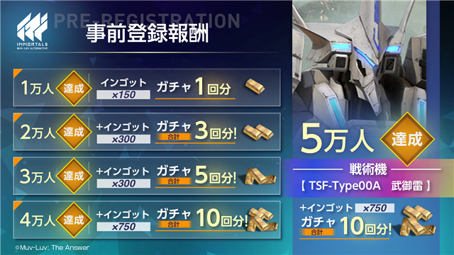 事前登録数が5万人を突破しました!実施済みのTwitterキャンペーンの報酬を含め、リリース時にガチャ合計20回分(インゴット3,000)&戦術機【TSF-Type00A 武御雷】のプレゼントが決定!