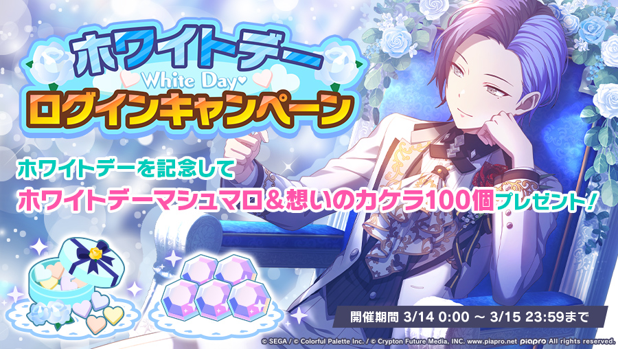 セガとColorful Paletteは、『プロジェクトセカイ カラフルステージ! feat. 初音ミク』で、「ホワイトデー2022ライブ」と「ホワイトデーログインキャンペーン」を3月14日0時から開催するとの予告を行った。また、「ホワイトデー2022ライブ」の開催に先立ち、バーチャルライブショップに期間限定アイテムを追加した。