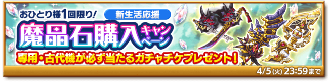 期間中、 「魔晶石購入キャンペーン」を開催します。魔晶石の合計購入金額が特定金額に達することで、 一部を除く専用武器・古代機だけがラインナップした「新生活応援ガチャチケット」をプレゼント!