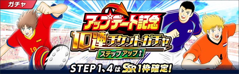 「アップデート記念 10連ガチャチケット」で回せる特別なガチャを開催!チケットは「アップデート記念 ログインボーナス」で手に入るぞ。 ログイン日数に応じて最大で150連分のガチャが回せる!また、 ガチャはステップアップ形式になっていて、 ステップ1、 4で1枠SSRが確定する。