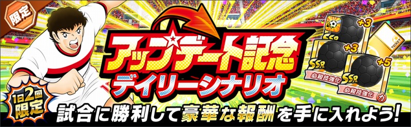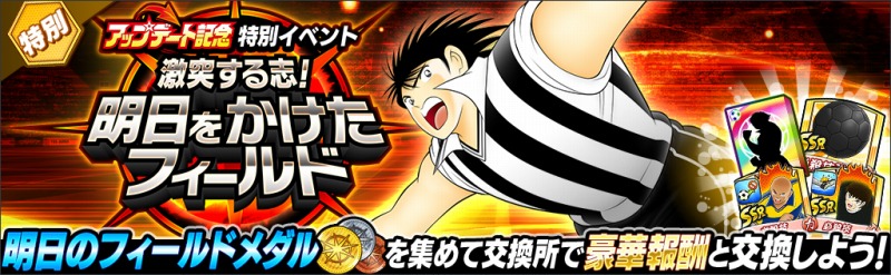 期間中繰り返しプレイできる周回イベントを開催!クリアで「明日のフィールドメダル」が獲得可能。 集めたメダルは交換所で「SSR確定ガチャチケット」や「ドリームポットガチャチケット」のほか、 「上限突破リセット券」、 「[必殺技ランクS]強烈なタックル(ロベルト・本郷)」、 「[必殺技ランクS]強引なパスカット(トラム)」などの豪華報酬と交換することができる。