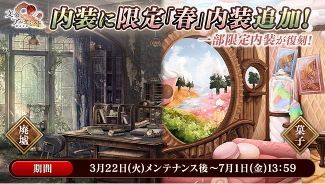 本日のメンテナンスにて、 新たな「春」内装を追加いたしました。 哀愁漂う「廃墟」の内装、 メルヘンな「菓子」の内装など、 司書室を自分好みに模様替えできます。