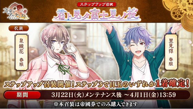 文豪の「衣装」や、 会派に装備する事で能力を強化できる「装像」などが入手できるコンテンツ「召装」に、 限定召装「君ト見タ富士見ノ桜」が期間限定で登場します。 この召装では新しく追加された泉鏡花と里見弴の〈春服〉を獲得できます。