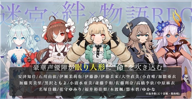 安済知佳、石川由依、伊瀬茉莉也、伊藤静、伊藤美来、大空直美、小倉唯、加隈亜衣、加藤英美里、黒沢ともよ、小清水亜美、斎藤千和、佐藤利奈、高橋李依、中原麻衣、名塚佳織、花守ゆみり、福井裕佳梨、本渡楓、悠木碧、ゆかな、ほか(敬称略)ら20名以上の有名声優が参加し、眠り人形に命を吹き込んでいる。