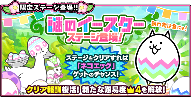 イースターイベント期間限定の「謎のイースター」ステージを開催!ステージクリアで限定キャラクター「ネコエッグ」を手に入れるチャンスとなっている。