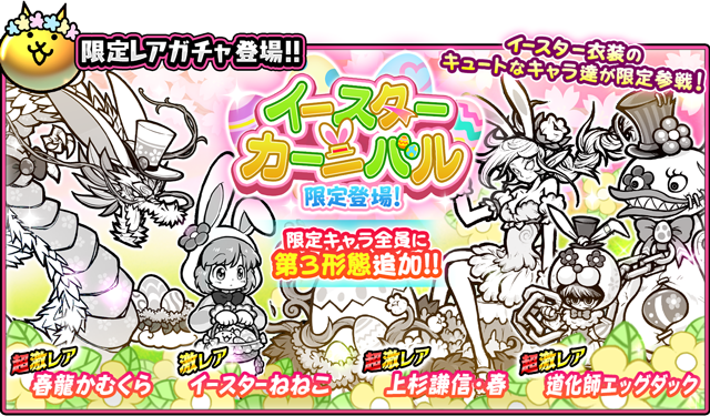 うららかな春の陽気を運ぶ期間限定レアガチャ「イースターカーニバル」を開催。レアガチャに登場する限定キャラクター全員に第3形態が追加される。今だけしか手に入らないキャラクターをゲットしよう。