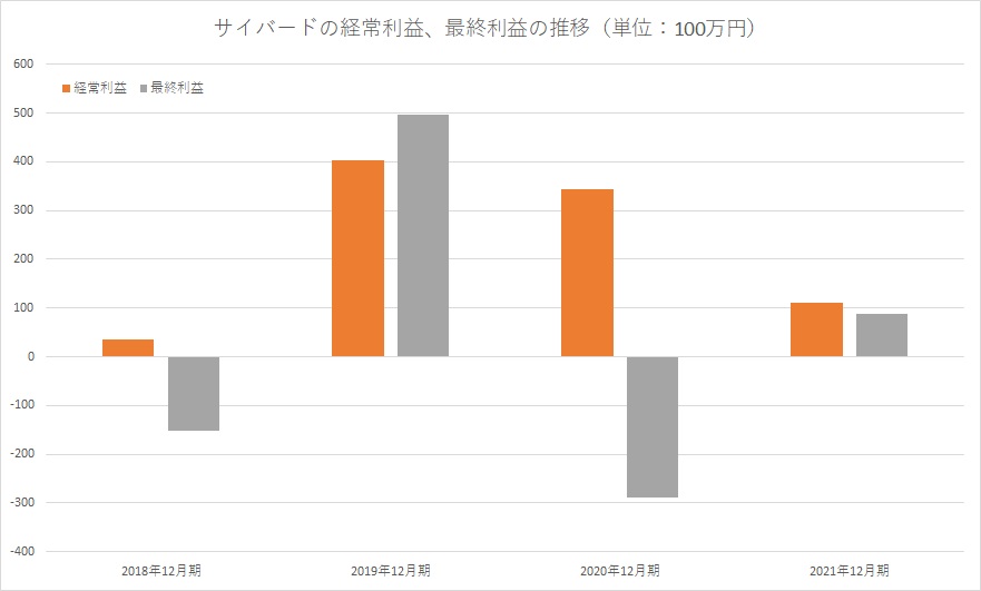 サイバードの2021年12月期の決算は、売上高60億円(前の期比13.1%減)、経常利益1億1100万円(同67.9%減)、最終利益8900万円(前の期は2億8900万円の損失)だった。
