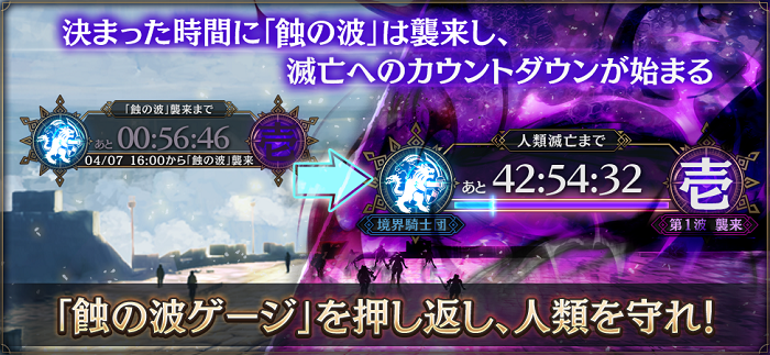 “蝕の波”が襲来すると人類滅亡までのカウントダウンが開始され、巨大な「使徒」や強力な「魔人」が出現。迫る敵を撃破しつつ“蝕の波ゲージ”を押し返し人類を守護しよう。蝕の波ゲージが満たされれば、貢献したプレイヤー全員が報酬を獲得できる。