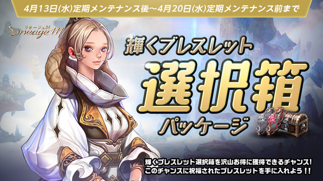 エヌ・シー・ジャパンは、 2022年4月13日にイベント「春のパイン祭り」や「ハーディンのテレポートの一部入場費用緩和」などの開催に加え、 対象ブレスレットへの「祝福」付与や、 「輝くブレスレット選択箱パッケージ」、 「輝く祝福のパッケージ」などの様々な商品が登場したことを発表した。