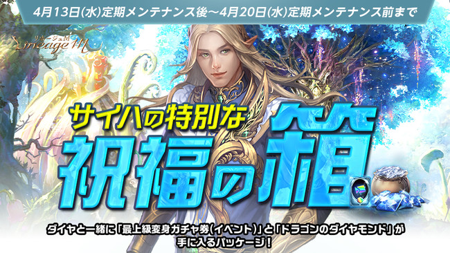 ダイヤに加え、 「最上級変身ガチャ券(イベント)」、 「ドラゴンのダイヤモンド」が獲得できる「サイハの特別な祝福の箱」が登場しました。本パッケージは1アカウントにつき4回まで購入可能です。