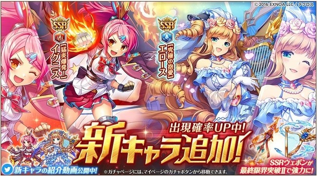 EXNOAは『神姫PROJECT A』において、4月13日に「イグニス」はSSR昇格、 「エロース」は新衣装で再登場したことを発表した。 さらに、 新しいSSR幻獣「蚩尤」も追加された。 また、 SSR幻獣が手に入る降臨戦イベントが復刻開催しているほか、 イベント「魔宝石襲来」の開催も発表した。