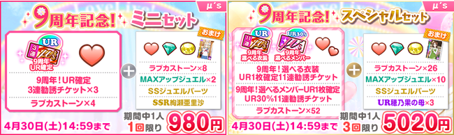 - 9周年記念!SR以上確定ピックアップブースト勧誘~μ's~3年生