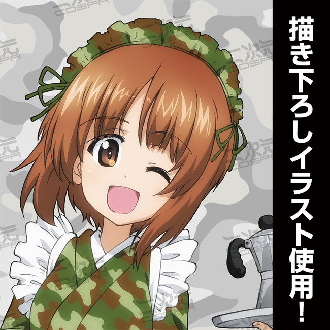 ミリタリー風のメイド服を身にまとった「西住みほ」「西住まほ」「西住しほ」「島田愛里寿」「島田千代」の描き下ろしイラストを使用したグッズが登場。