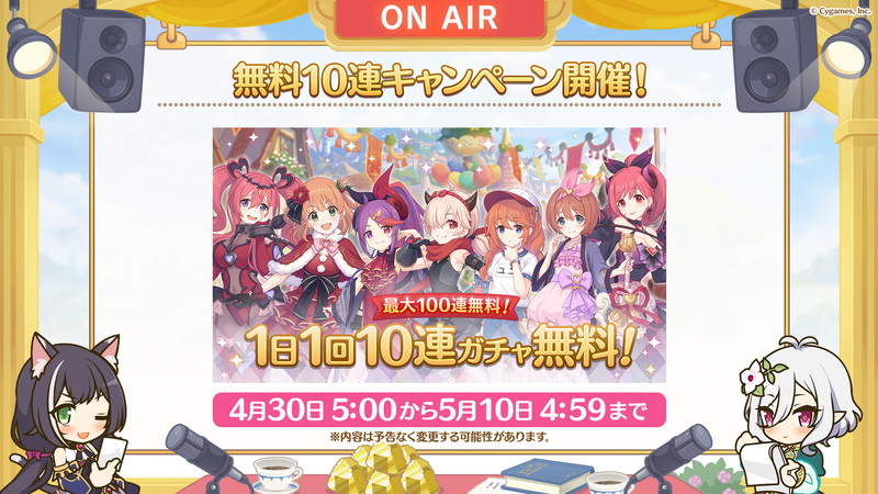 4月30日5時より、「最大100連!1日1回10 連ガチャ無料キャンペーン」を開催する。キャンペーン期間中に開催中のガチャの「10 回引く」を最大10回まで1日1回無料で引くことができる。