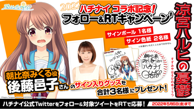 期間中、 八月のシンデレラナイン公式アカウント(@hachinai89 https://twitter.com/hachinai89 )をフォローし、 ハッシュタグ「#ハチナイ_涼宮ハルヒ登場」や「#ハチナイ_朝比奈みくる登場」を含む公式ツイートをリツイートした人の中から、 直筆サインボールやサイン色紙をプレゼント。