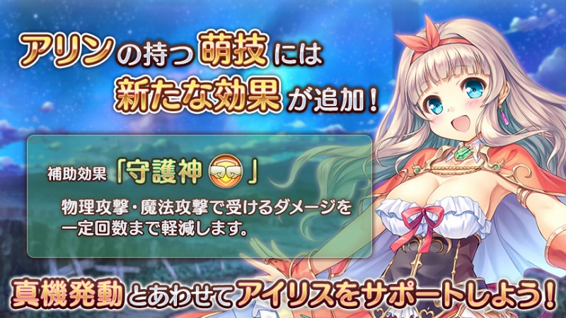 バトルでは新たな補助効果『守護神』などを駆使して仲間を守りつつ、物理攻撃も魔法攻撃も使いこなし、 どのような場面でも活躍が期待できるアイリス。