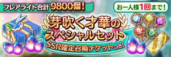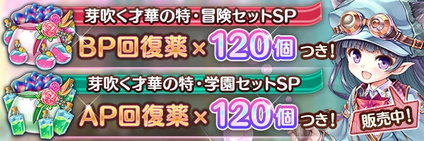フレアライトとBP回復薬がセットになった『芽吹く才華の特・冒険セットSP』&『芽吹く才華の特・冒険セット』と、フレアライトとAP回復薬がセットになった『芽吹く才華の特・学園セットSP』&『芽吹く才華の特・学園セット』が登場した。SPセットは特にお得になっている。