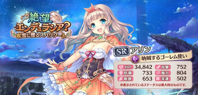 4月29日より、 RからSSRのアリンの各種聖装がピックアップされている、『絶望エンデュラシア?召喚』『絶望エンデュラシア?ステップアップ召喚』が期間限定開催。ステップアップ召喚では5ステップごとにSSR聖装が1着確定、うちSSRアリン【壮気溢れる操縦者】は50%の確率で出現する。