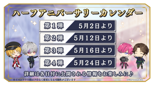 マーベラス<7844>は、『千銃士:Rhodoknight』において、5月24日に迎えるハーフアニバーサリーを記念して様々なイベントやキャンペーンを開催する。